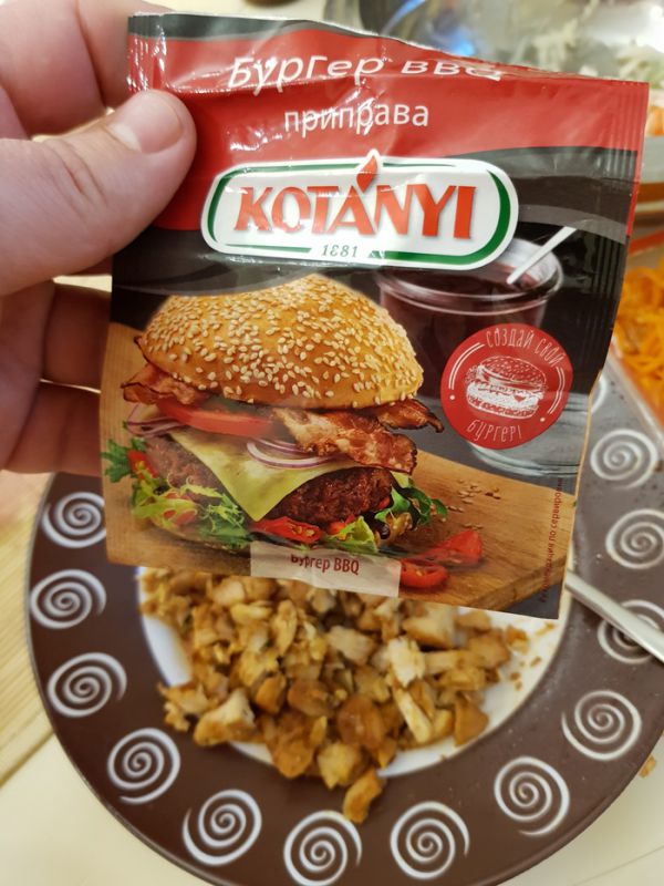 Куриное филе я обжаривал на сильном огне не крупными кусочками с приправой KOTANYI (специи используйте какие вам больше нравятся). Затем уже обжаренные кусочки курицы порубил на более мелкие.