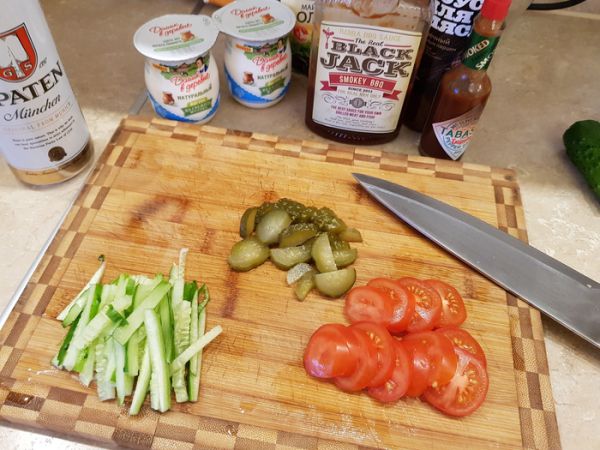 Соленый огурец нарезаем полукольцами или соломкой в зависимости от размера и оставляем его отдельно.
