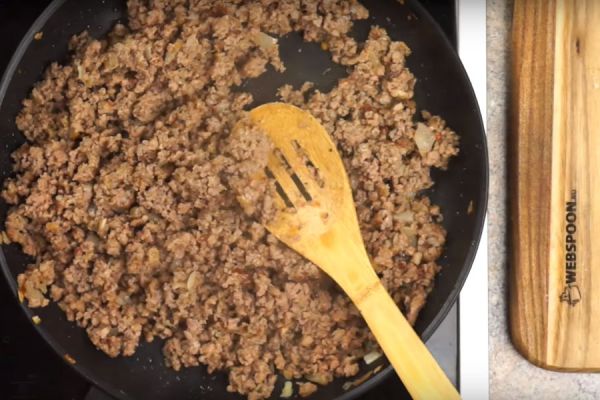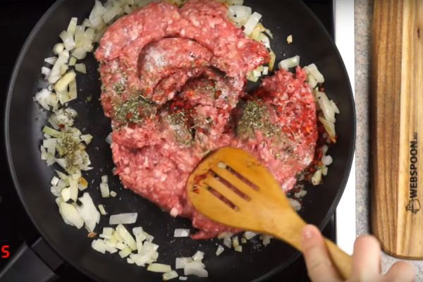 Обжарить лук, добавить фарш, соль, прованские травы и паприку.