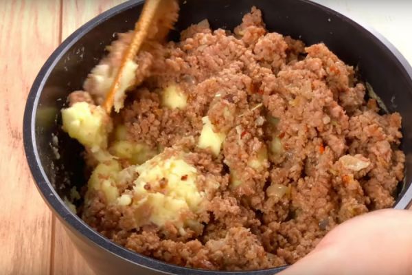 Смешать фарш с пюре.