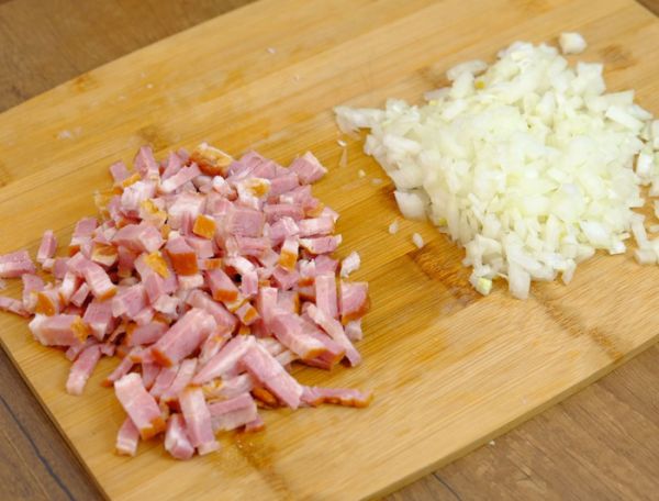 2. Мелко нарезать лук, бекон (грудинку) - полосками.