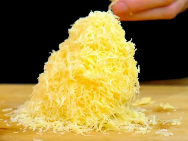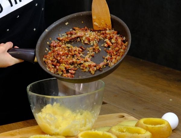 6. Толкушкой размять картофельную серединку, добавить сливочное масло, сыр, лук и бекон, посолить и перемешать.