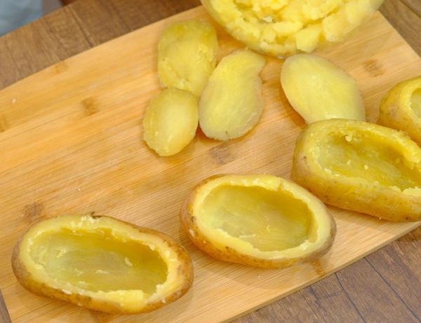 5. Срезать верхнюю часть картофеля вдоль. При помощи чайной ложки достать серединку.