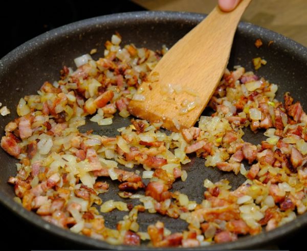 4. Обжарить бекон или грудинку, чтобы вытопился жир. Когда бекон (грудинка) подзолотится, добавить лук и жарить до румяности. Если вытопившегося жира мало, добавьте немного растительного масла.