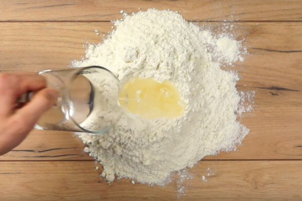 В муке сделать ямочку, куда вылить подсолнечное масло и частями доливать воду.