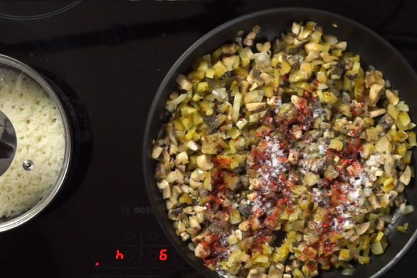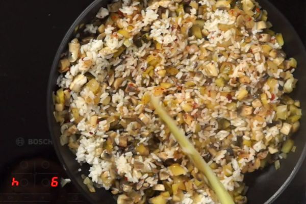 Перемешиваем начинку с рисом.