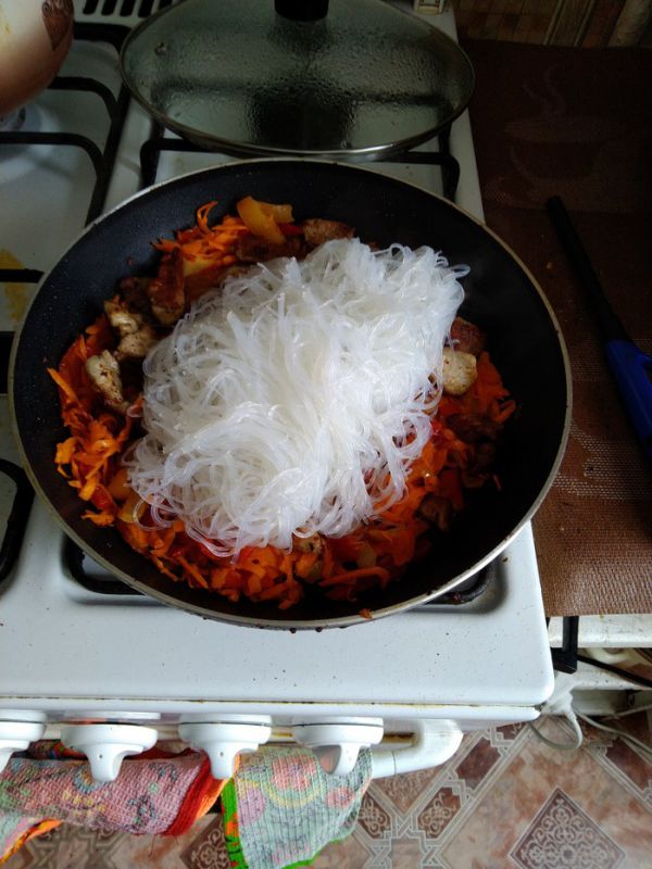 3. Пока обжариваются овощи кипятим воду и заливаем фунчозу на 4 минуты,потом промывание как обычные макароны.