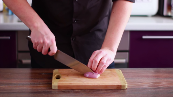 Нашинковать салат айсберг, маринованный огурец нарезать кружками, мелким кубиком нарезать лук-шалот и корнишон.