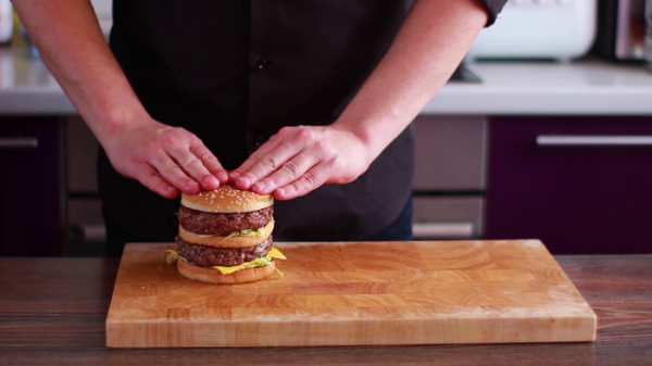 Собираем Биг-Мак: на нижнюю булочку намазываем соус, посыпаем луком, добавляем салат, ломтик сыра чеддер и выкладываем котлету. Кладём среднюю булочку, намазываем её соусом, посыпаем луком, добавляем салат, два кружочка маринованного огурца и выкладываем котлету. Сверху закрываем булочкой.