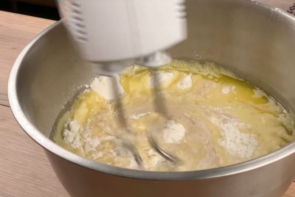 В большую миску просейте 500 г муки, добавьте сахар, ванильный сахар, молоко, растопленное сливочное масло, взбитые яйца и подошедшую опару. Все перемешайте миксером около 10 минут.