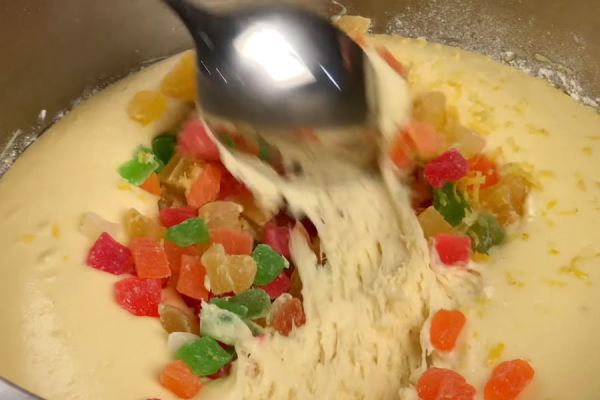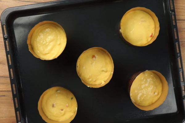 В настоявшееся тесто добавьте цукаты или изюм, цедру 1 лимона и раскладывайте по формам.
