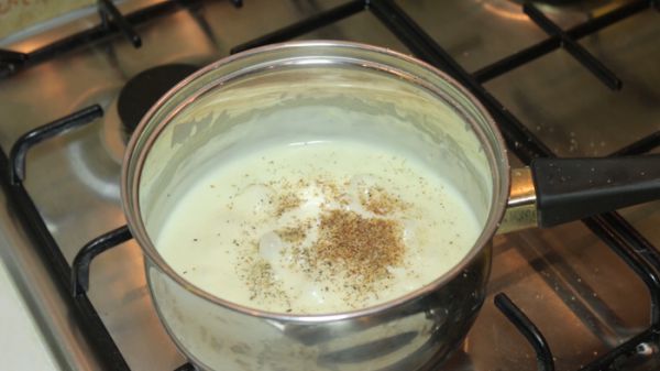 Через 10 минут соус уже практически готов. Добавляем в него черный молотый перец и щепотку мускатного ореха. Я предпочитаю натирать мускатный орех самостоятельно, так гораздо лучше раскрывается его аромат.