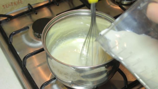 Добавляем 500мл. молока. Рекомендую добавлять его не сразу всё, а постепенно, при этом активно помешивая содержимое сотейника, чтобы не было комочков, и смесь получилась однородной.