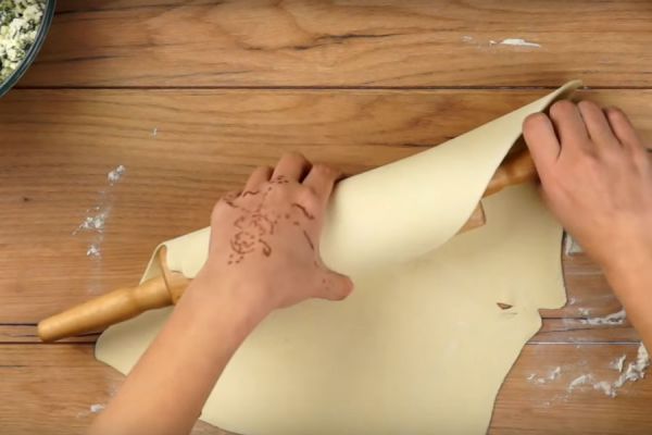 Первым делом разморозьте шпинат и откиньте его на сито, чтобы стекла лишняя жидкость. Сыр натрите на терке и смешайте со шпинатом, солью, перцем и сметаной.