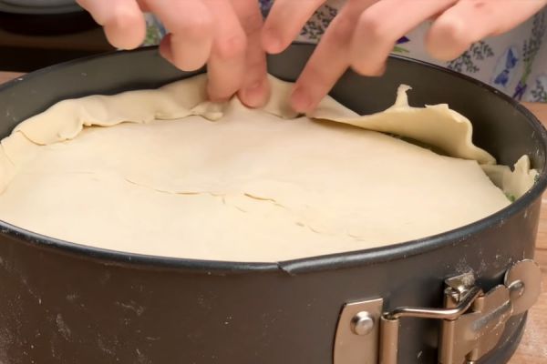 Раскатайте еще один такой же кусок теста и накройте им пирог. Подрежьте лишние края теста и защипните.