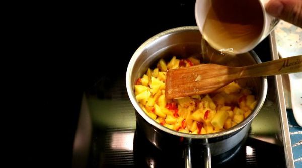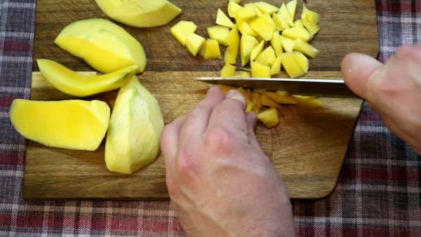 Чистим манго и нарезаем мелко (лук приготовили?), добавляем к луку и чили тушиться.