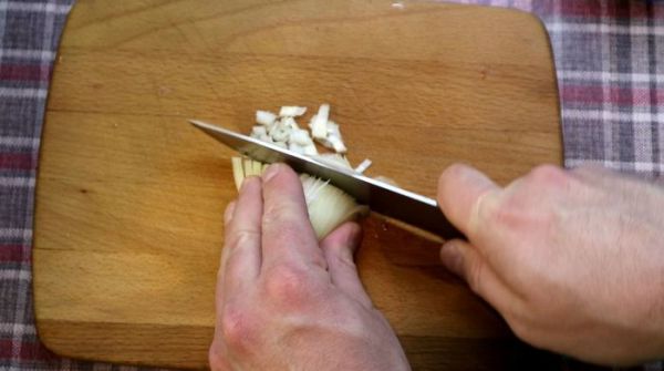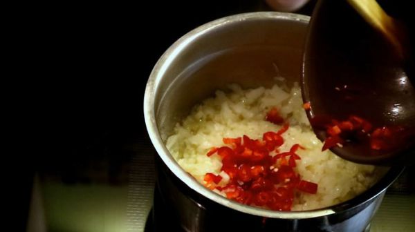 Пока лук готовится нарезаем чили перцы, тоже мелко и отправляем к луку. Тушим до золотистости лука на среднем огне.