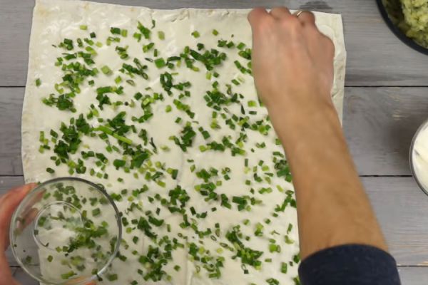 Возьмите 1 лаваш, намажьте его плавленым сыром и посыпьте слоем нарезанного лука.