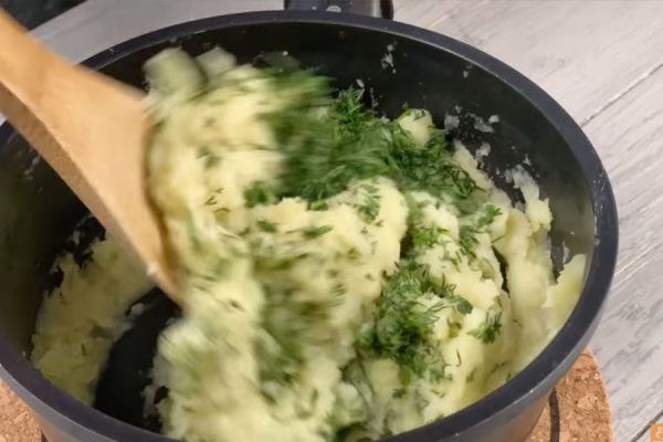 Начните с приготовления пюре, оно должно быть свежее и хорошо намазываться. В готовое пюре, добавить сливосное малсо и укроп, хорошо перемешать.