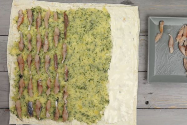 Накройте 2-м лавашом. Намажьте на него пюре так, чтобы последние 5 см были чистыми. Этот кусочек нужно смазать плавленым сыром, чтобы рулет хорошо склеился. На всю площадь пюре разложите селёдку. Сверните рулет, оберните в пищевую плёнку и поместите его в холодильник на 1-2 часа для пропитки.