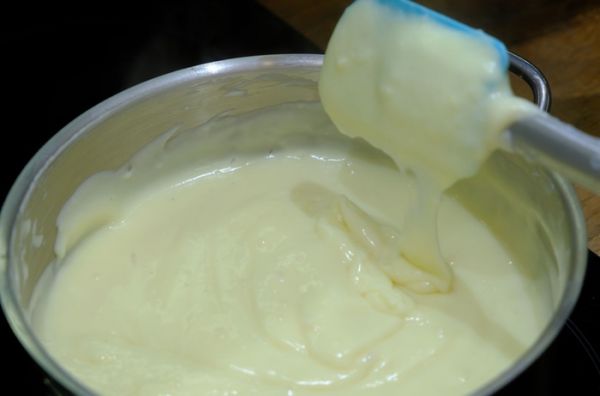 Добавить к яйцам и муке небольшое количество горячего молока, процеженного через сито, быстро перемешать, ввести остальное молоко. Перелить в кастрюлю и варить крем до загустения, постоянно помешивая, чтобы не было комочков. Если все же комочки появились, то можно пропустить крем через сито.
