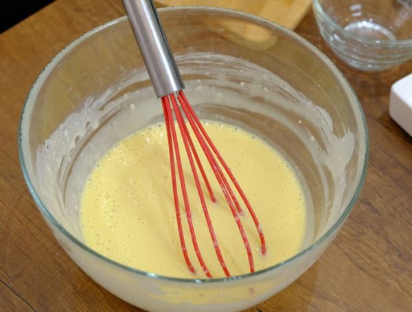 Муку просеять, маленькими порциями добавить холодное молоко, перемешивая, чтобы не было комочков. Добавить сахар, ванильный сахар, щепотку соли и два желтка. Хорошо перемешать до однородности.