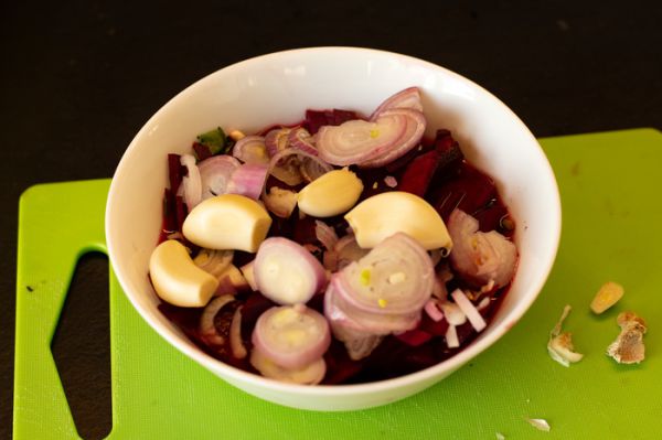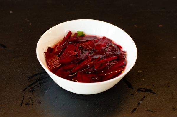 Тонко нарежем свеклу и утрамбуем в миске так, чтобы вся свекла была в него обмакнута.