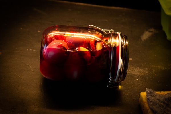 Кладём яйца в банку. Заливаем кипяточком с уксусом и овощами. Закрываем крышку и оставляем остыть. Теперь яйца могут промариноваться. Так они выглядят через час.
