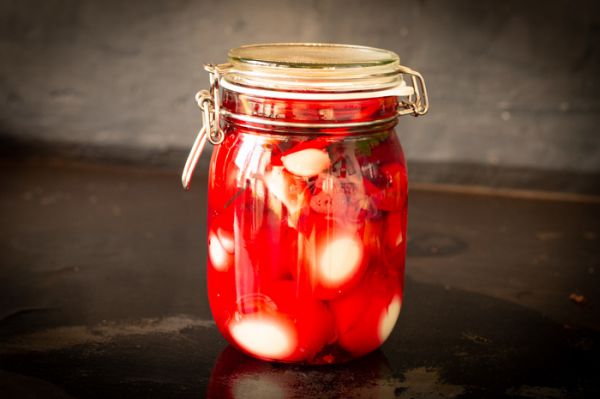 Оптимально есть такие яйца вприкуску с теми самыми маринованными перчиками, запивая всяким. Если кусать перчик не любите - тогда добавляйте в маринад его порезанным, дабы отдал остроту быстрее.