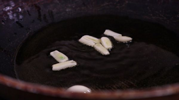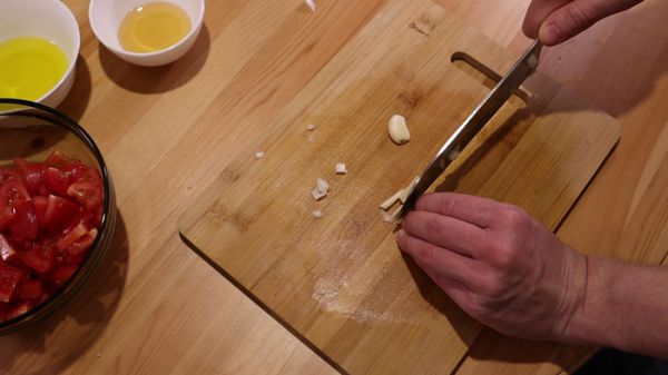 Чеснок нужно нарезать длинными полосками или просто раздавить ножом.