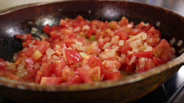 После того, как лук обжарится нам нужно добавить помидорки и тушить все это в течение 15-20 минут.