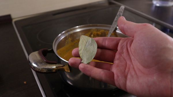 После того, как убрали соус с огня, кидаем в него лавровый лист и оставляем постоять минут на 15-20. Спустя это время вынимаем лавровые листы.