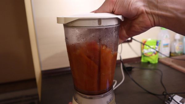 Спустя это время убираем нашу луково-томатную кашу с огня, слегка остужаем и перемалываем в блендере.