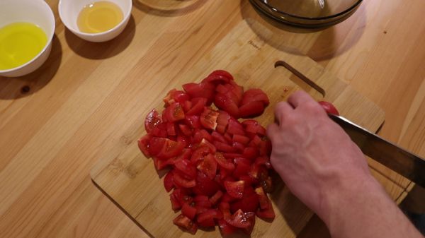 Первым делом нужно снять с помидор кожицу. Для этого просто обдаем их кипятком, делаем надрез и легко снимаем с него шкурку.