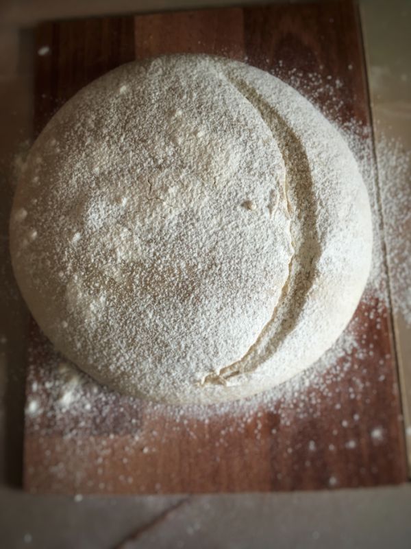 Ферментация закончилась и нам нужно провести деление и предварительную формовку хлебов. Для этого переворачиваем контейнер с тестом на подпыленный мукой стол и даем ему самому выпасть. Чем меньше мы сейчас мнем тесто, тем красивее и пористее будет мякиш. Разделяем скребком тесто на две части и подкатываем заготовки. Их нужно припылить мукой и накрыв пленкой оставить на столе минут на 20. За это время тесто привыкнет к новой форме и будет легче формоваться.