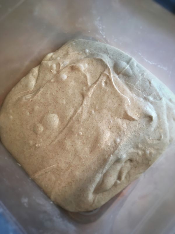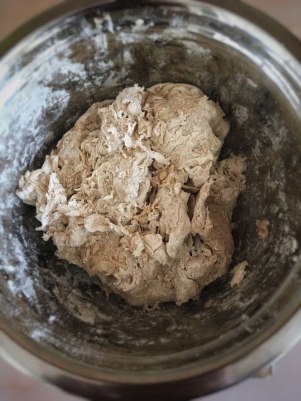 Для начала нам нужно всю муку залить 600 граммами воды и хорошо перемешиваем. Когда мы увлажнили всю муку, то оставляем ее на аутолитическую паузу на 30-60 минут. За это время глютеновые связи начнут активно формироваться, и вы увидите, что после такого отдыха, тесто будет уже шелковым и хорошо развитым. Если замешиваете в миксере или тестомесильной машине, то смешиваем на первой скорости.