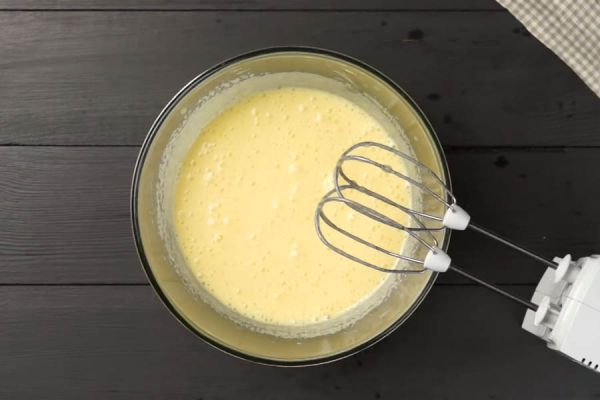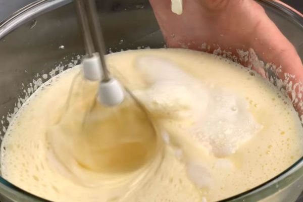 Добавить 1 столовую ложку мёда, 150 мл сметаны, 90 грамм растопленного сливочного масла, соду (1 ч. л.) и столовый уксус (1 ст. л.). Взбивать ещё 1 минуту.