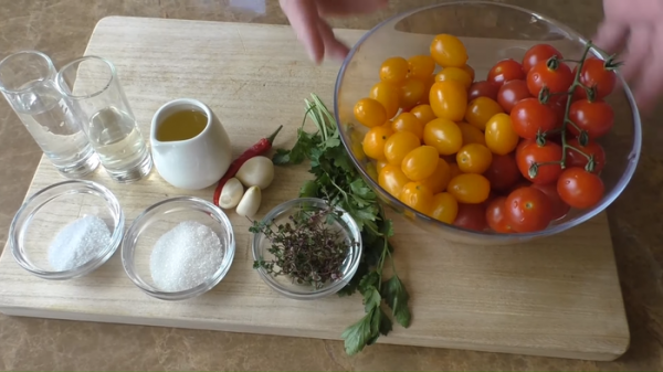 Лучше всего взять помидоры черри, очень аппетитные на вид и приготовятся быстрее.