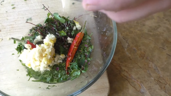 Готовим заправку, для начала сахар и соль зальем водой и размешаем почти до полного растворения. Теперь добавляем измельченную зелень петрушки и тимьяна, чеснок, уксус и растительное масло. На свой вкус острый перец просто разрезал пополам и отправим в заправку.