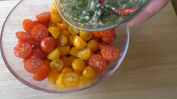 Черри порежем пополам и заливаем заправкой-маринадом. Аккуратно перемешиваем и оставляем настоятся минут на 40-60. Можно оставить на столе, а можно переложить в банку и убрать в холодильник.