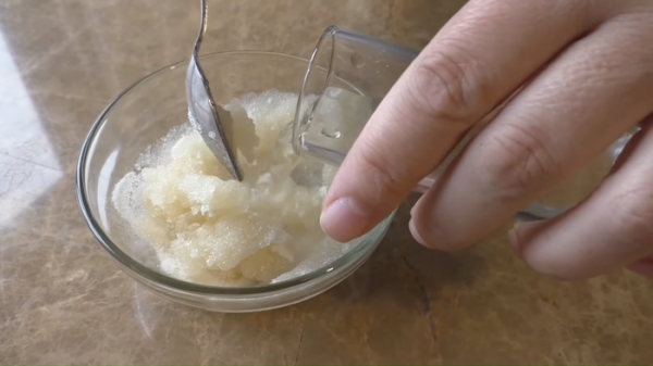 Для начала добавляем в желатин несколько ложек кипяченной (холодной) воды и даем настоятся (согласно инструкции на упаковке). Мой желатин постоял 10 минут, после чего ставим в микроволновку и растапливаем до жидкого состояния.