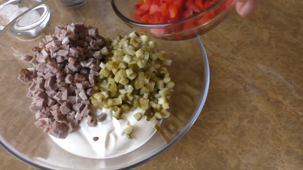 Мясо, перец и огурцы порежем мелким кубиком и добавляем в сметану. Сюда же соль, перец и сахар, хорошо перемешиваем.