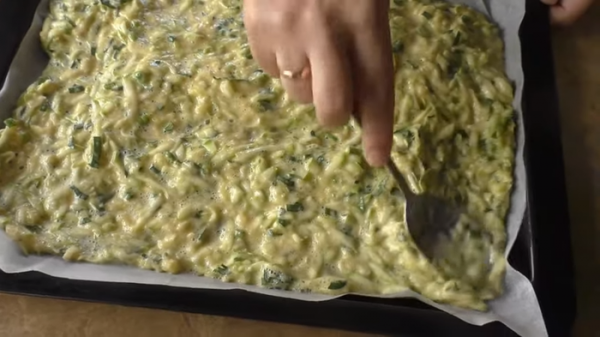 Кабачковое тесто выкладываем (распределяем) на подготовленный противень (застелен силиконизированным пергаментом, обычный пергамент смажьте растительным маслом)и отправляем в разогретую духовку минут на 15-20, температура 200 градусов.