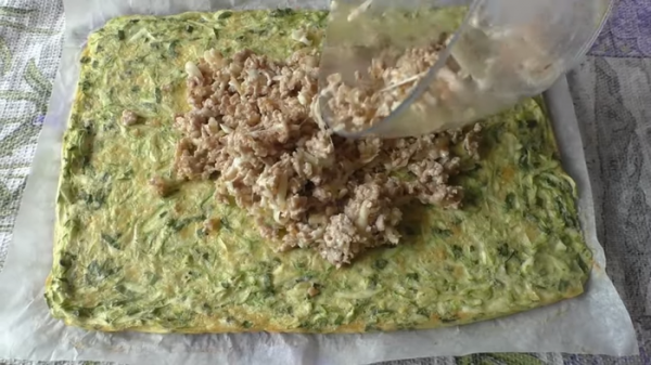 Основа готова. Фарш слегка остыл, теперь добавляем сыр, перемешиваем. Распределяем начинку на кабачковую основу.