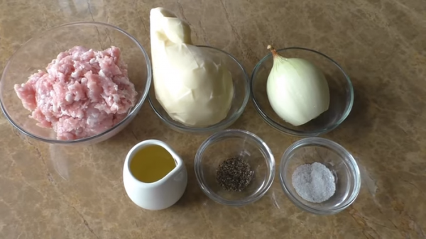 Лук обжариваем до легкой золотистости (в небольшом количестве масла), сюда же добавляем фарш. Как только обжарится останется присолить и поперчить.