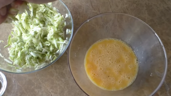 Готовится очень просто и всегда получается вкусным и эффектным. Кабачки натрем на крупной терке и слегка отожмем.