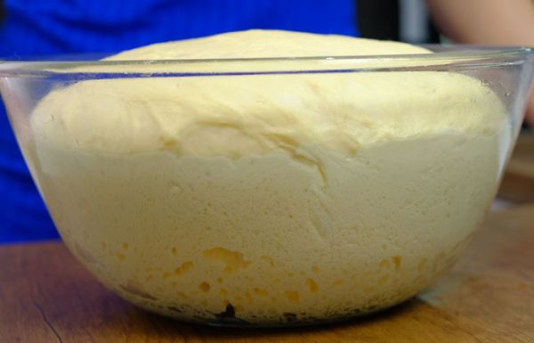 Миску смазать растительным маслом, тесто округлить и переложить в миску, накрыть полотенцем, оставить подходить при комнатной температуре приблизительно на 1,5 часа. Время зависит от комнатной температуры. Тесто должно удвоиться в объеме.