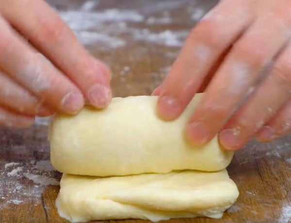 Поверхность припылить мукой, каждую булочку раскатать в овал, края теста сложить к центру, получается прямоугольник. Прямоугольник раскатать в длину, делая один край теста более широким. Скатать тесто в ролл, край зафиксировать. Звучит сложно, но на видео все понятно и очень быстро.