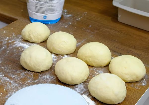 Из такого количества теста получится 2 буханки хлеба. Разделить все тесто на 7-8 частей. Округлить каждую часть. Накрыть полотенцем, чтобы тесто не заветривалось, пока будем работать с каждой отдельной булочкой.