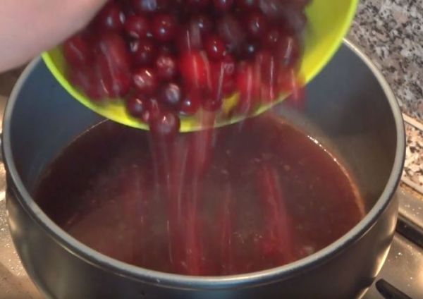 Минуты через 3-4 когда все ингредиенты уже отдали вину свой аромат, можно их УБИРАТЬ из вина шумовкой - цедру лимона, апельсина, палочку корицы, гвоздички. Добавляем клюкву, варим на медленном огне ещё порядка 5-ти минут.